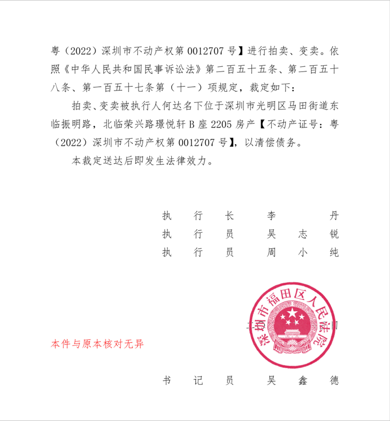 拍卖标的:深圳市光明区马田街道东临振明路,北临荣兴路璟悦轩B座2205