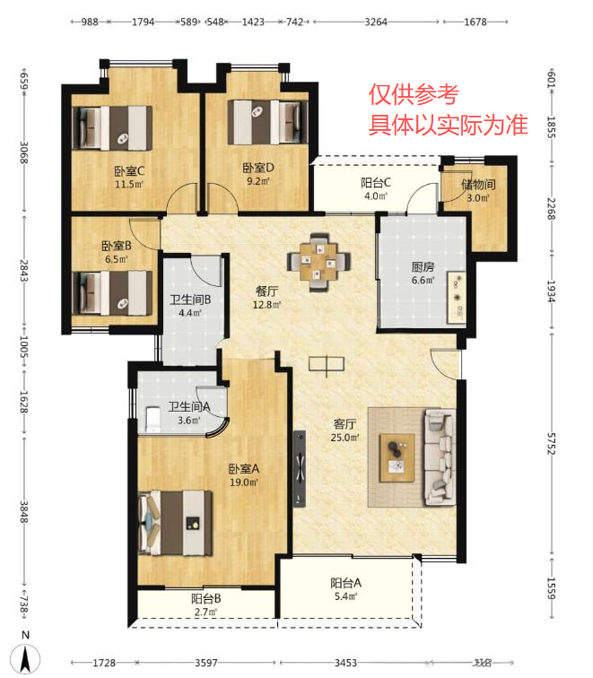 户型特点:四房两厅两卫三阳台,格局方正,空间利用率高,南北通透,通风采光俱佳;