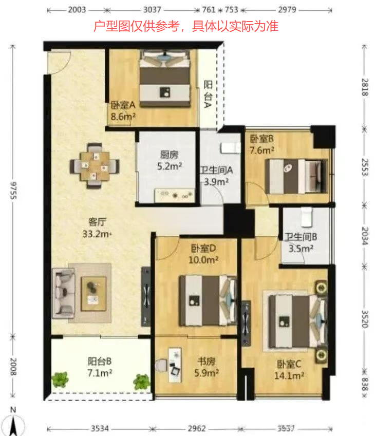 户型特点:4房2卫,使用率超100%,正南朝向,客餐厅一体宽敞明亮,厅出大阳台,南北通透,采光通风良好;