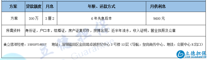 后面通过合伙人的推荐,联系到立德担保的邓经理,邓经理了解清楚张总的资料情况,基于成本问题,建议张总拿配偶名下那套二楼商铺来操作。评估后最高可贷足7成300万,额度高利息还低。